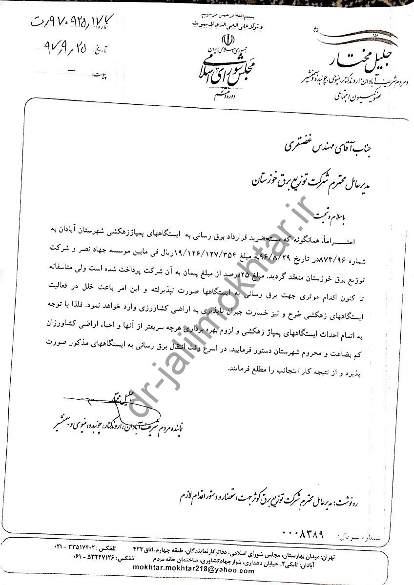 - مکاتبه و پیگیری برق رسانی به ایستگاه های پمپاژ زهکشی موسسه جهاد نصر و به مدیر عامل شرکت برق استان