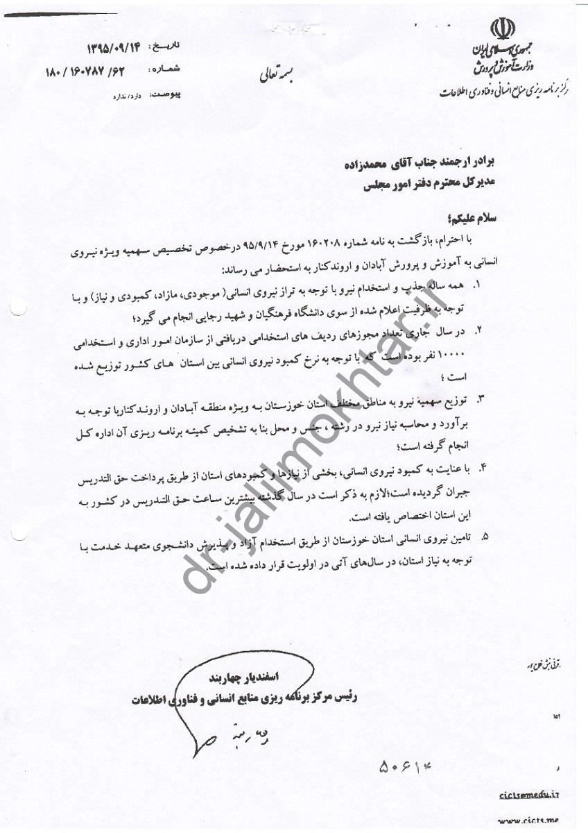 پیگیری هادرخصوص تامین نیروی انسانی آموزش و پرورش آبادان + پاسخ ها