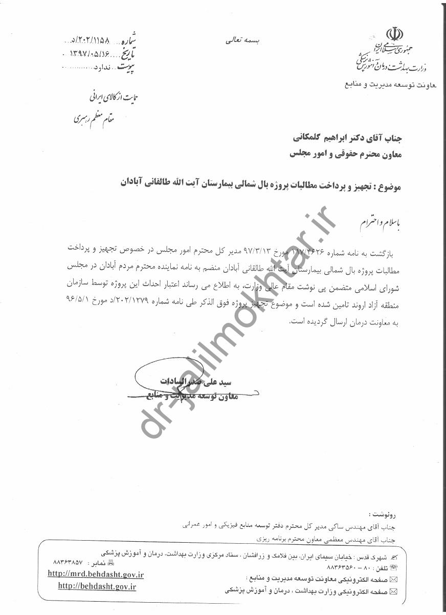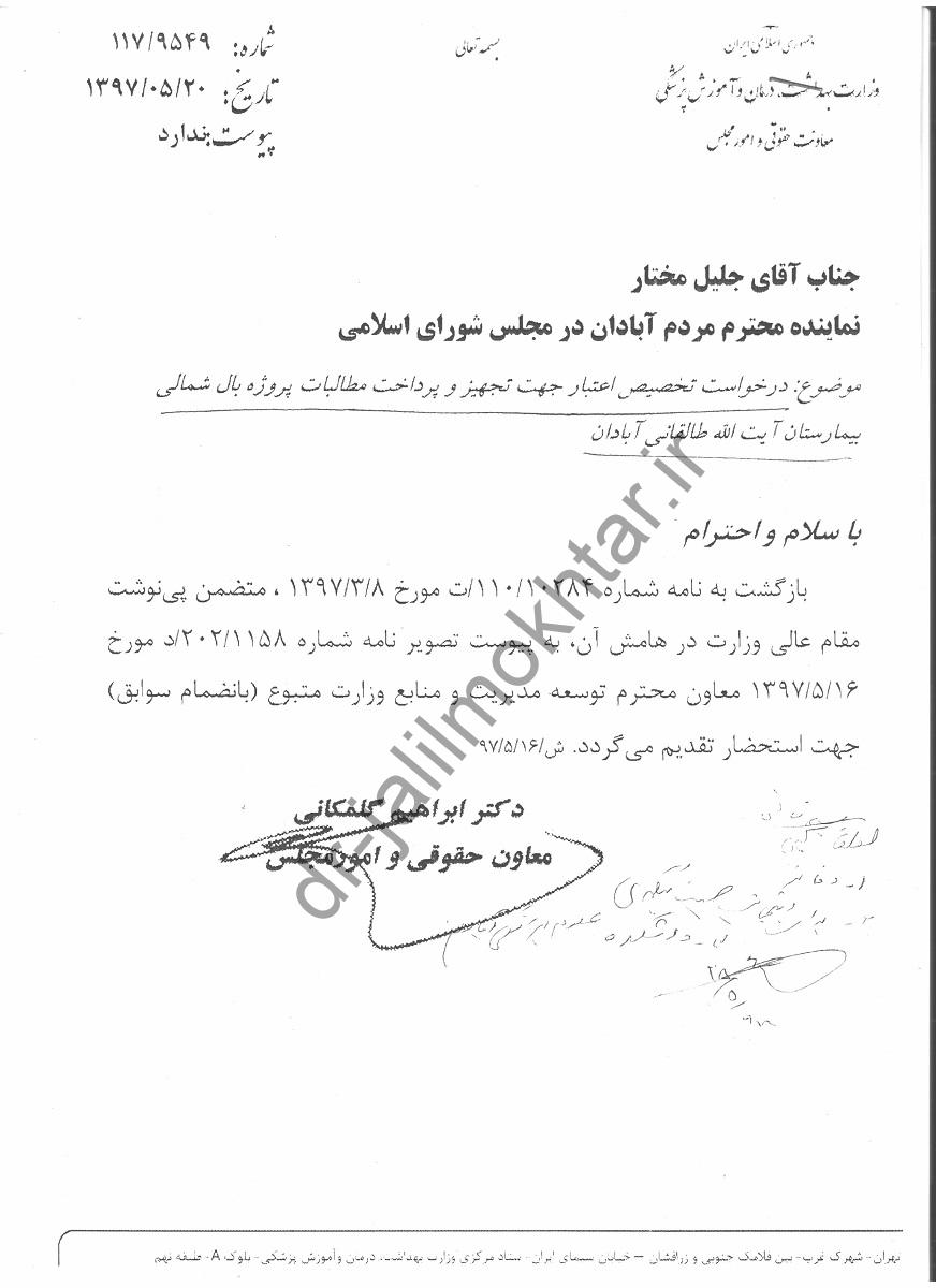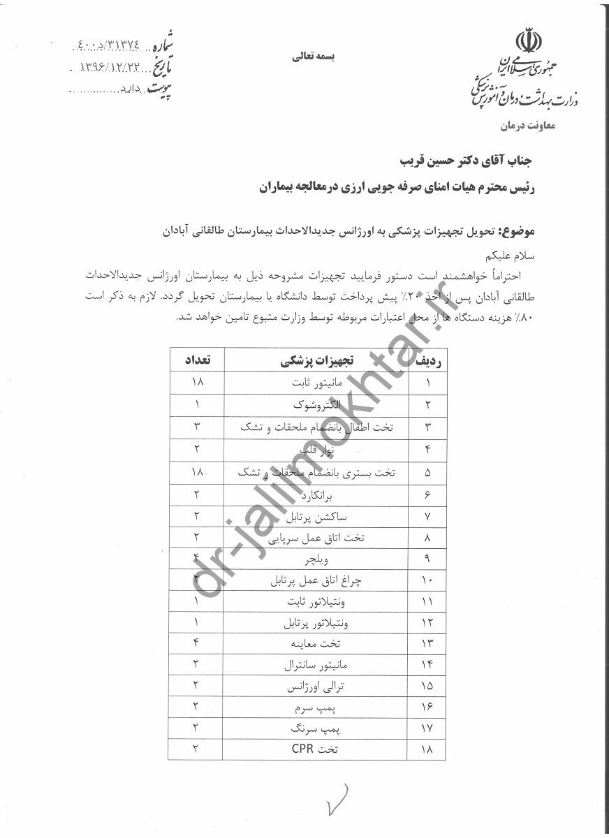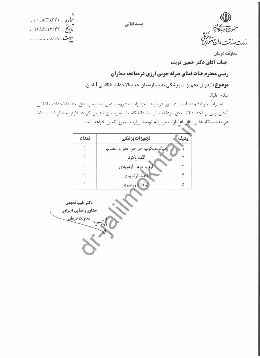 نامه ها و پیگیری هابهداشت و درمانبیمارستان ها پیگیری تجهیزات اتاق های عمل و سایر بخشهای بیمارستان طالقانی آبادان توسط kh-d - مارس 13, 2018 اشتراکگذاری DiggMixReddItVKWhatsAppTelegramPrintCopy URL