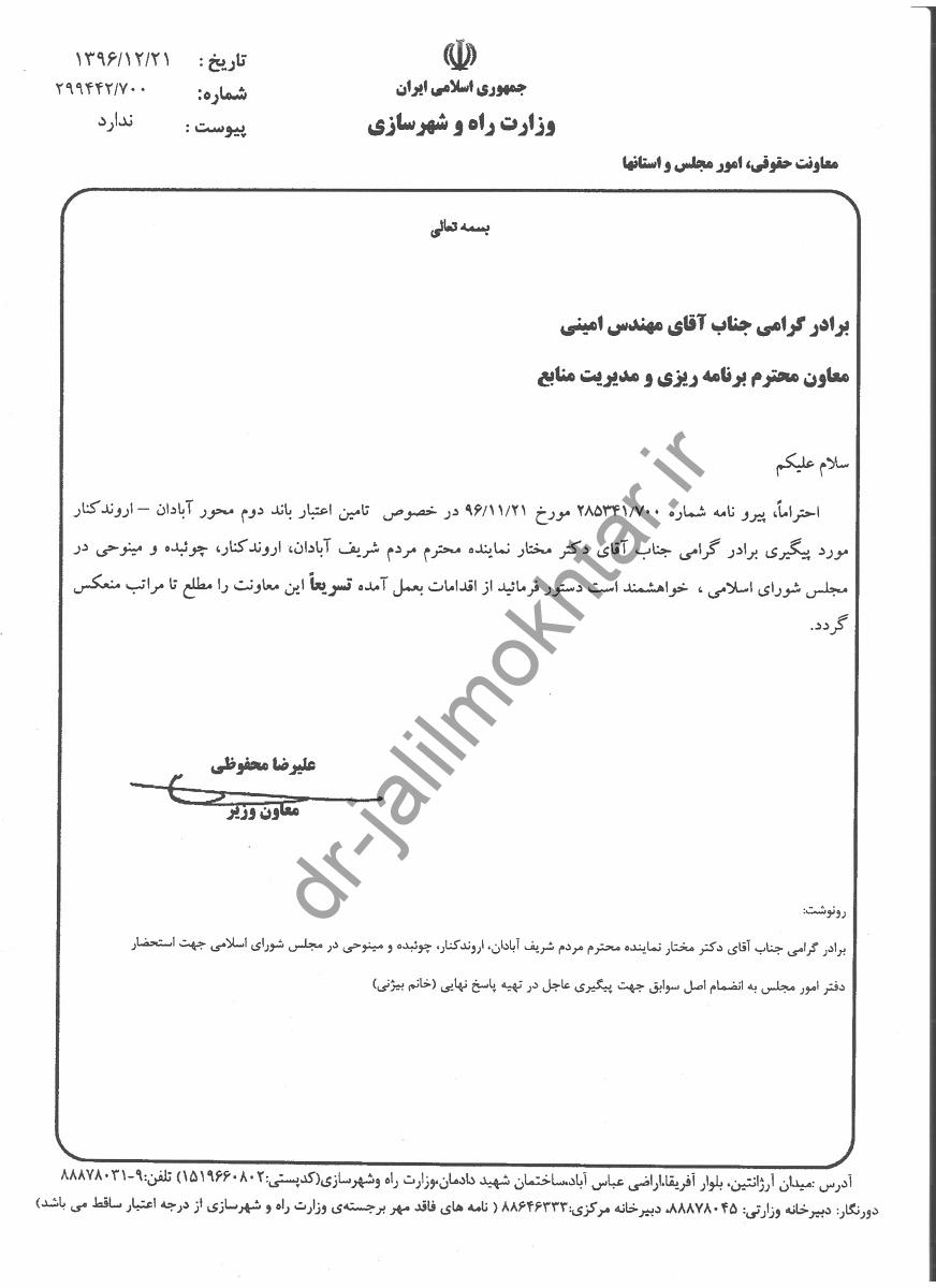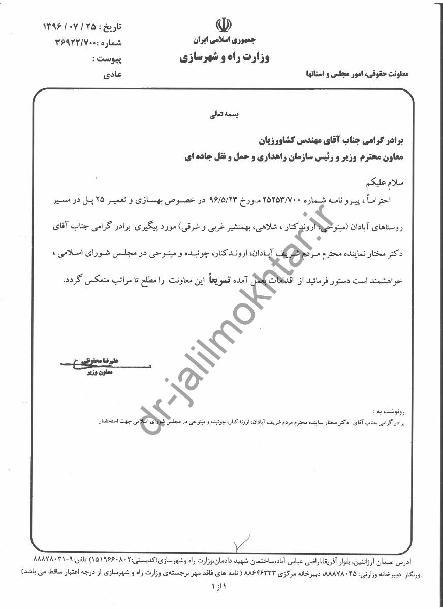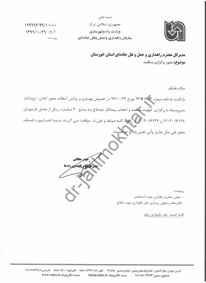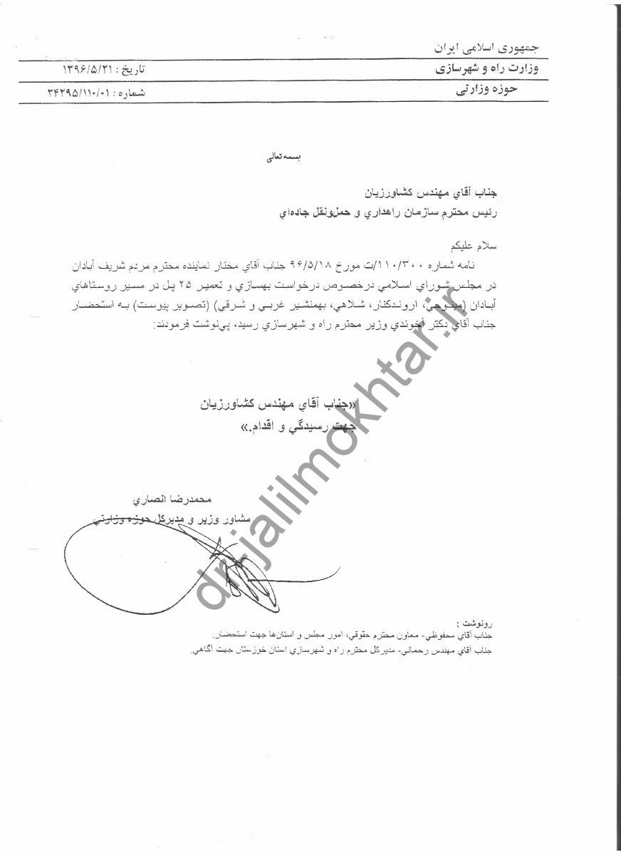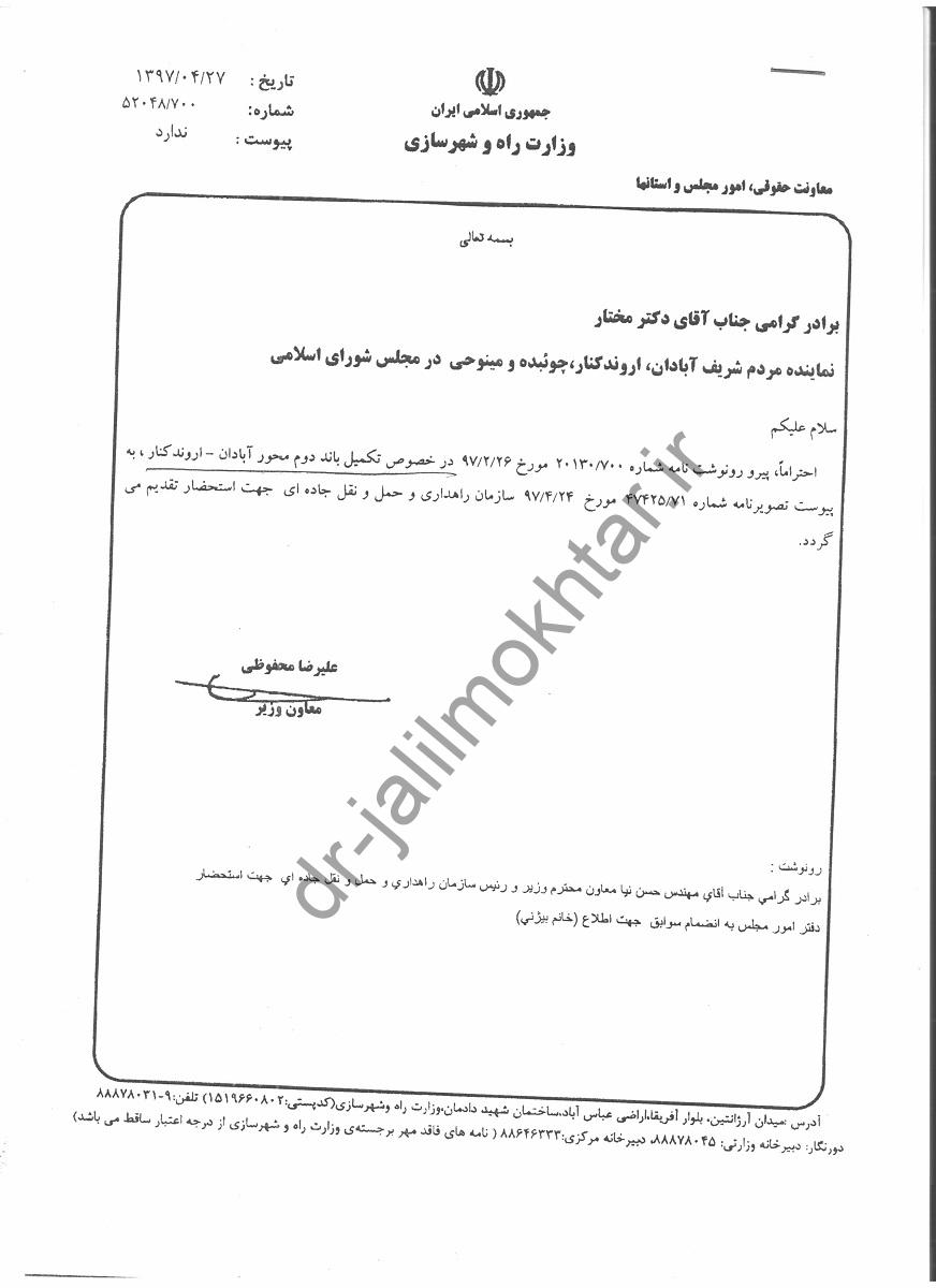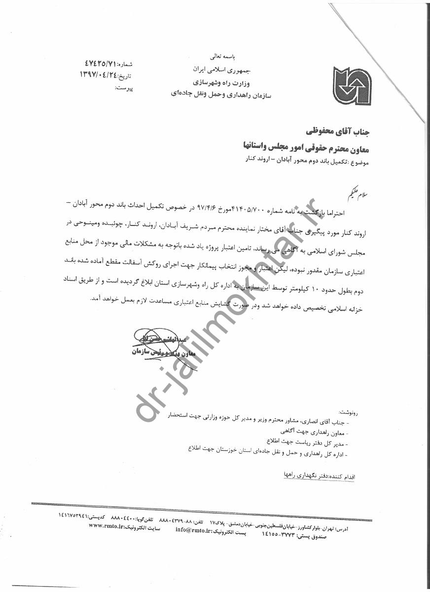 زمانی مدیر عامل سازمان منطقه آزاد اروند – غلامعباس بهرام نیا – حسن نیا عضو محترم هیات عامل و معاون راهداری – مدیر کل محترم راهداری و حمل نقل جاده ای استان خوزستان – حیدر مطاعی مدیر کل دفتر نگهداری راه ها – انصاری مشاور وزیر و مدیر کل حوزه وزارتی – امینی معاون برنامه ریزی و مدیریت منابع – دکتر آخوندی وزیر راه و شهر سازی – علی عماد مشاور و مدیر کل حوزه استانداری – علیرضا محفوظی معاون وزیر – دکتر خادمی معاون وزیر و مدیر عامل شرکت ساخت و توسعه زیربناهای حمل نقل کشوری – کشاورزیان رئیس سازمان راهداری و حمل نقل جاده ای – صدیقه نظاری مدیر کل دفتر امور مجلس –