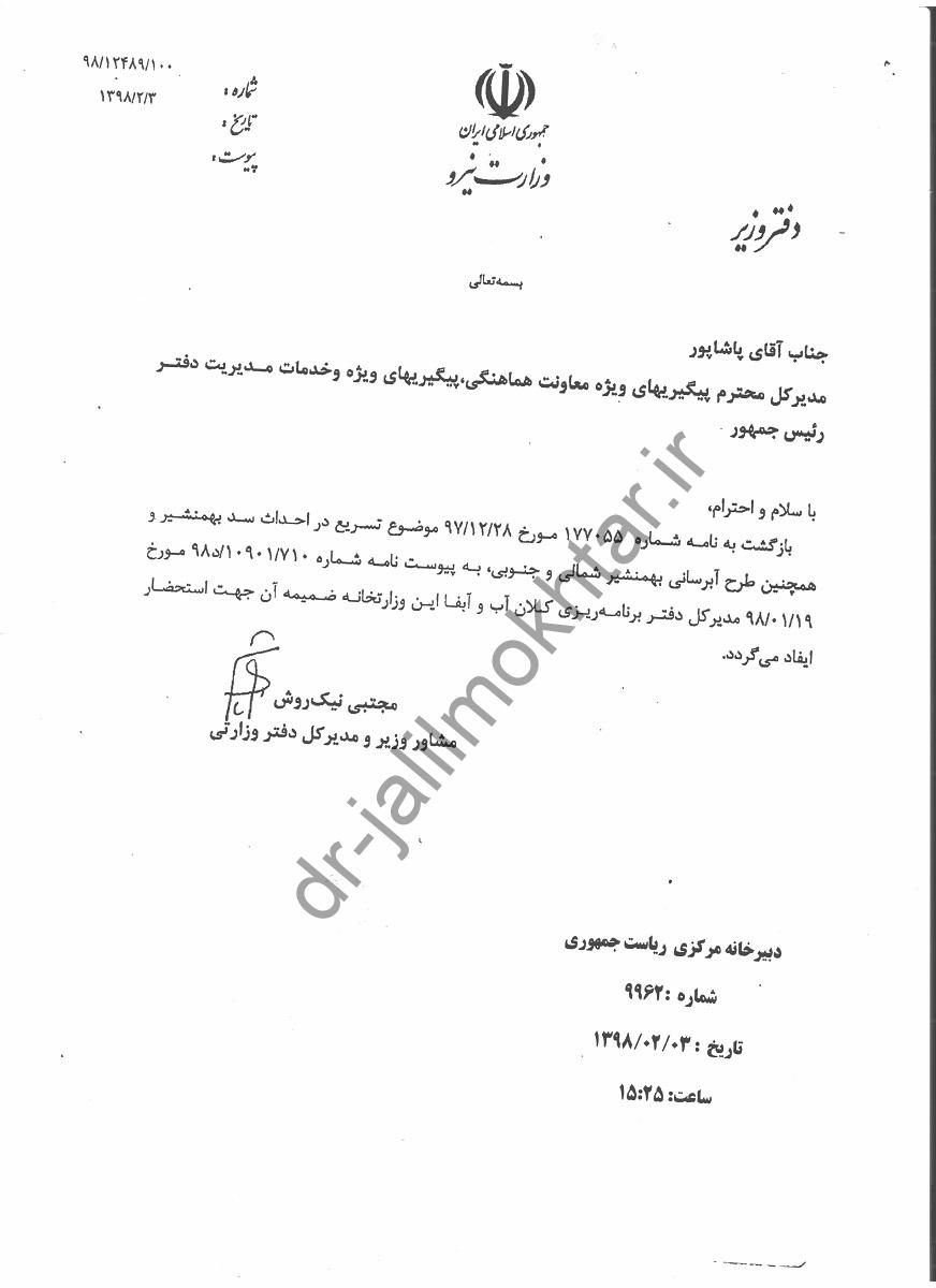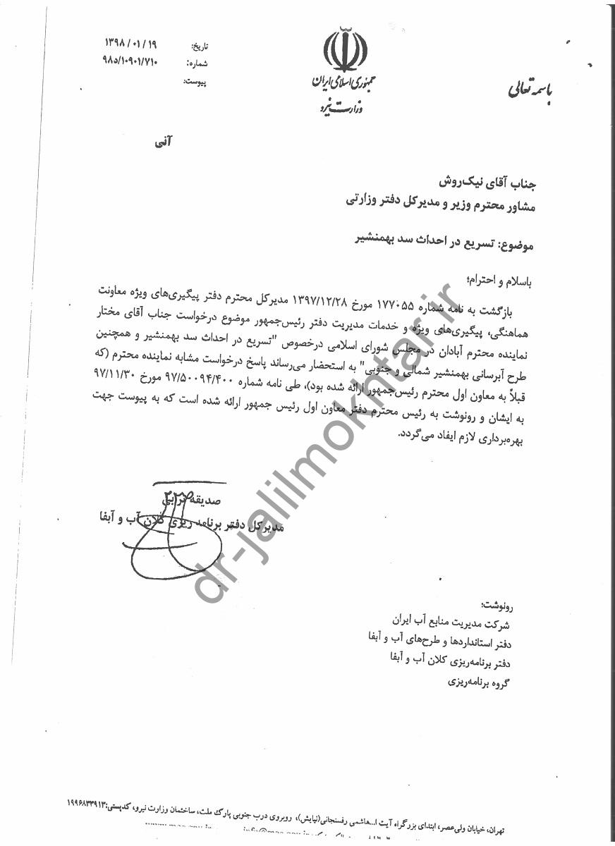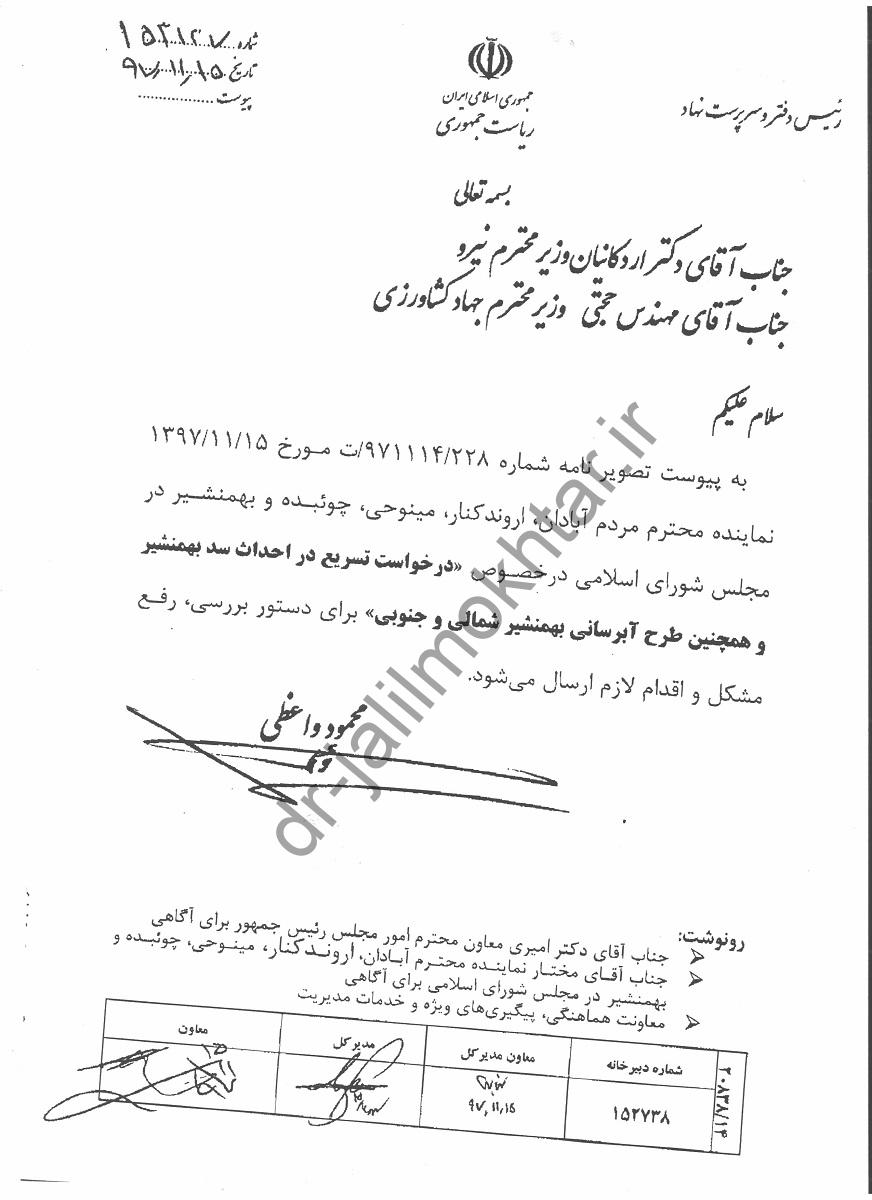 تسریع در احداث سد بهمنشیر و همچنین طرح آبرسانی بهمنشیر شمالی و جنوبی