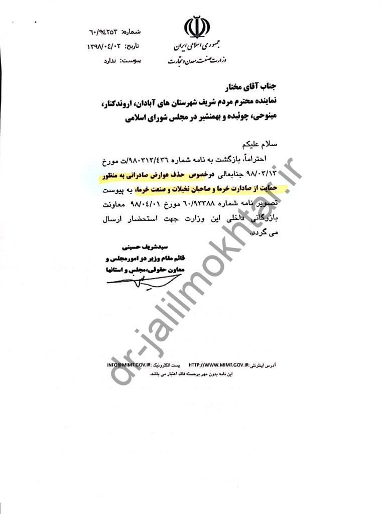 - مکاتبه با دکتر لاریجانی در خصوص پرداخت خسارت افت تولید خرما در دو سال متوالی زرعی .