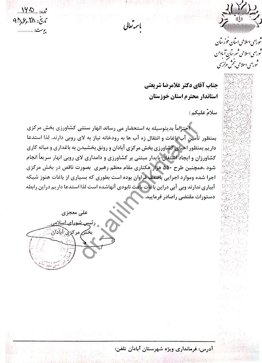 نامه ها و پیگیری هارئیس جمهور ، مجلس ، استانداری و فرمانداریشورای شهر ، شهرداری ها و دهیاری ها درخصوص تسریع در رفع مشکلات شورای بخش مرکزی آبادان توسط kh-d - اکتبر 1, 2019 اشتراکگذاری DiggMixReddItVKWhatsAppTelegramPrintCopy URL