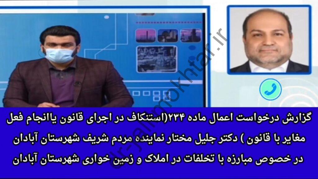 ✅ گزارش درخواست اعمال ماده ۲۳۴ (استنکاف در اجرای قانون یا انجام فعل مغایر با قانون ) دکتر جلیل مختار نماینده مردم شریف شهرستان آبادان در خصوص مبارزه با تخلفات در املاک و زمین خواری شهرستان آبادان