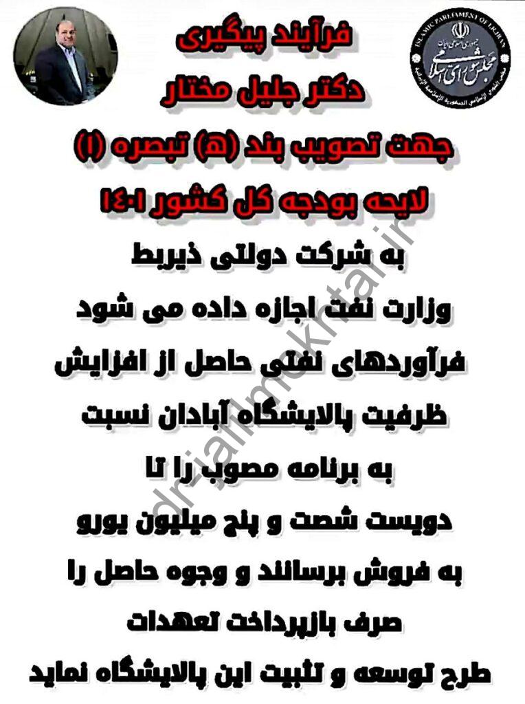 فرآيند پيگيری دكتر جليل مختار جهت تصويب بند (ه‍) تبصره (١) لايحه بودجه كل كشور ١٤٠١(بازپرداخت تعهدات طرح توسعه و تثبیت پالایشگاه آبادان )