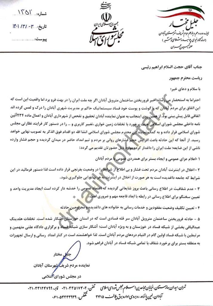 🔹نماینده آبادان طی یک نامه خطاب به ابراهیم رئیسی با اشاره به فروریختن ساختمان متروپل در آبادان از رئیس جمهور خواست ضمن اعلام عزای عمومی و ایجاد بستر برای همدردی عمومی با مردم آبادان خواهان جلوگیری از اختلال در اینترنت خوزستان شد. جلیل مختار در این نامه حادثه فروریختن ساختمان متروپل آبادان را سر قله فسادی دانست که در استان خوزستان آشکار شده است. وی در این نامه افزود: تخلفات عبدالباقی بخشی از شبکه فساد در خوزستان و به ویژه آبادان است؛ آشکار سازی شبکه فساد و برگزاری دادگاه علنی متهمین و مرتبطین با شبکه فساد اولین گام در التیام دردهای مردم آبادان است.*