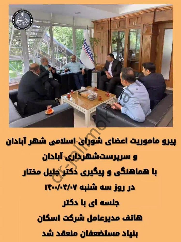 ✅پیرو ماموریت اعضای شورای اسلامی شهر آبادان وسرپرستشهرداری آبادان با *هماهنگی و پیگیری دکتر جلیل مختار در روز سه شنبه ۱۴۰۰/۰۴/۰۷جلسه ای با دکتر هاتف مدیرعامل شرکت اسکان بنیاد مستضعفان منعقد شد