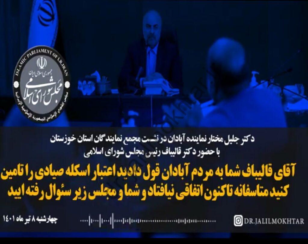 🔹اقای قالیباف شما به مردم آبادان قول دادید اعتبار اسکله صیادی را تامین کنید متاسفانه تاکنون اتفاقی نیافتاده و شما و مجلس زیر سوال رفته اید