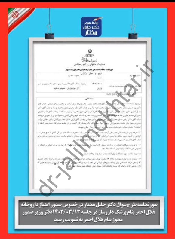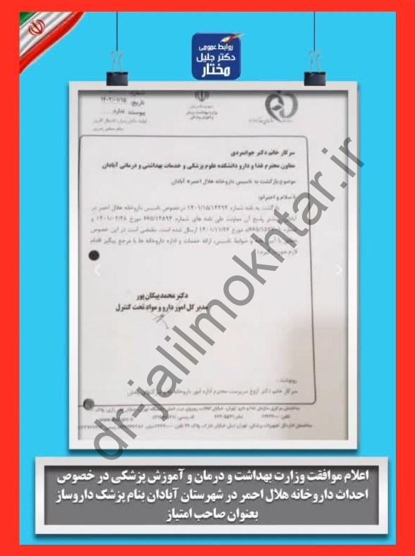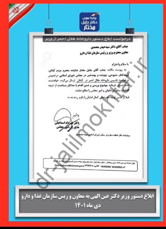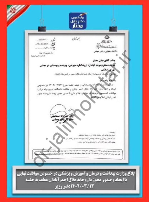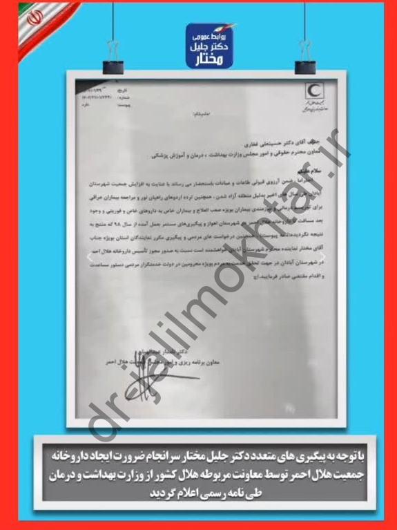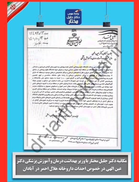 پیگیری و مكاتبات دكتر جليل مختار با وزير بهداشت درمان و آموزش پزشكی دكتر عين الهی در خصوص احداث دارخانه هلال احمر در شهرستان آبادان