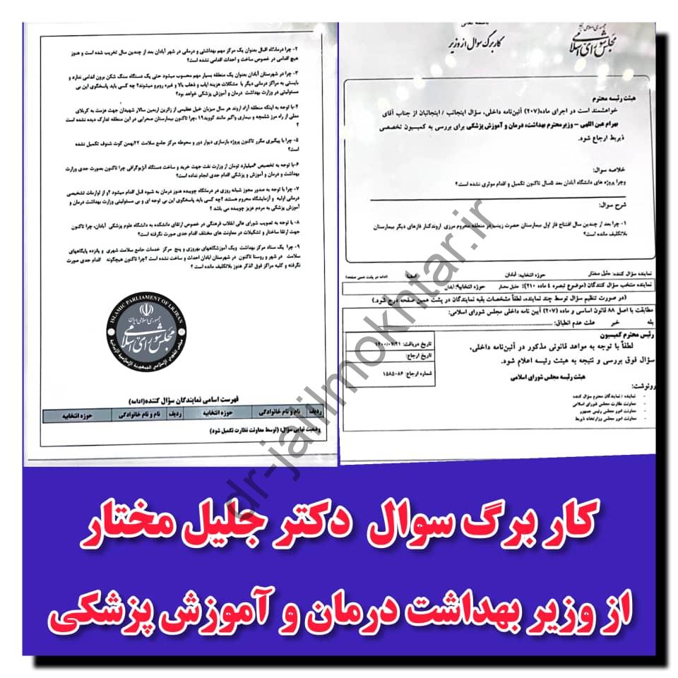 🔹پيرو طرح سوال دكتر جليل مختار در خصوص وضعيت درماني شهرستان ابادان از وزير بهداشت و درمان و اموزش پزشكي كشور